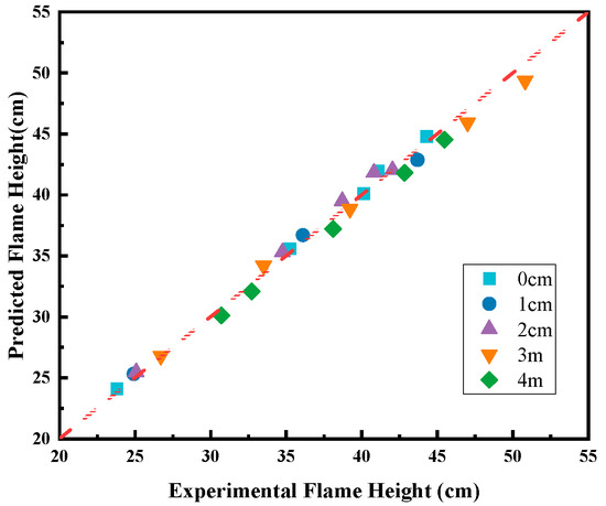 For zero quartz sand layer thickness, flame height increased with fuel mass, but exhibited markedly diminished growth rates beyond 90 g. Consequently, mref was fixed at 90 g. Fitting 23 experimental datasets via the Levenberg–Marquardt algorithm yielded the following coefficients: a = 31.69, k1 = 0.18, k1 = 0.5, k1 = 0.12, k1 = 0.8, k1 = 0.15.