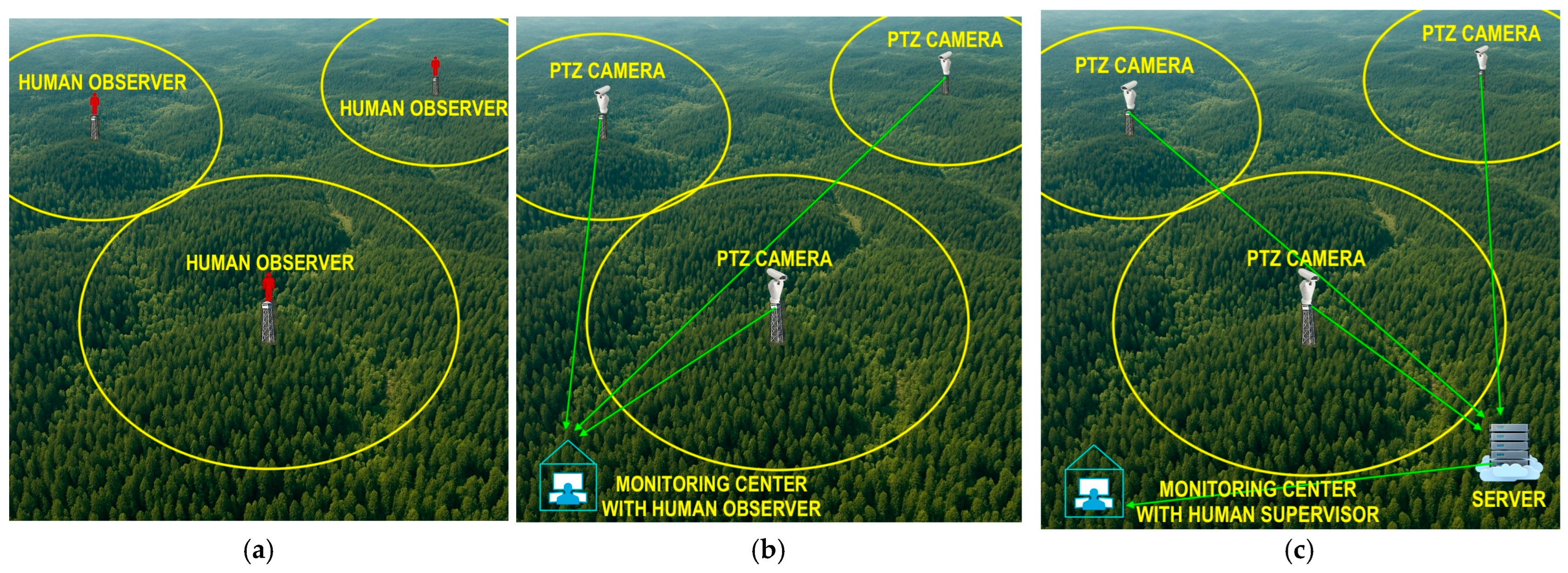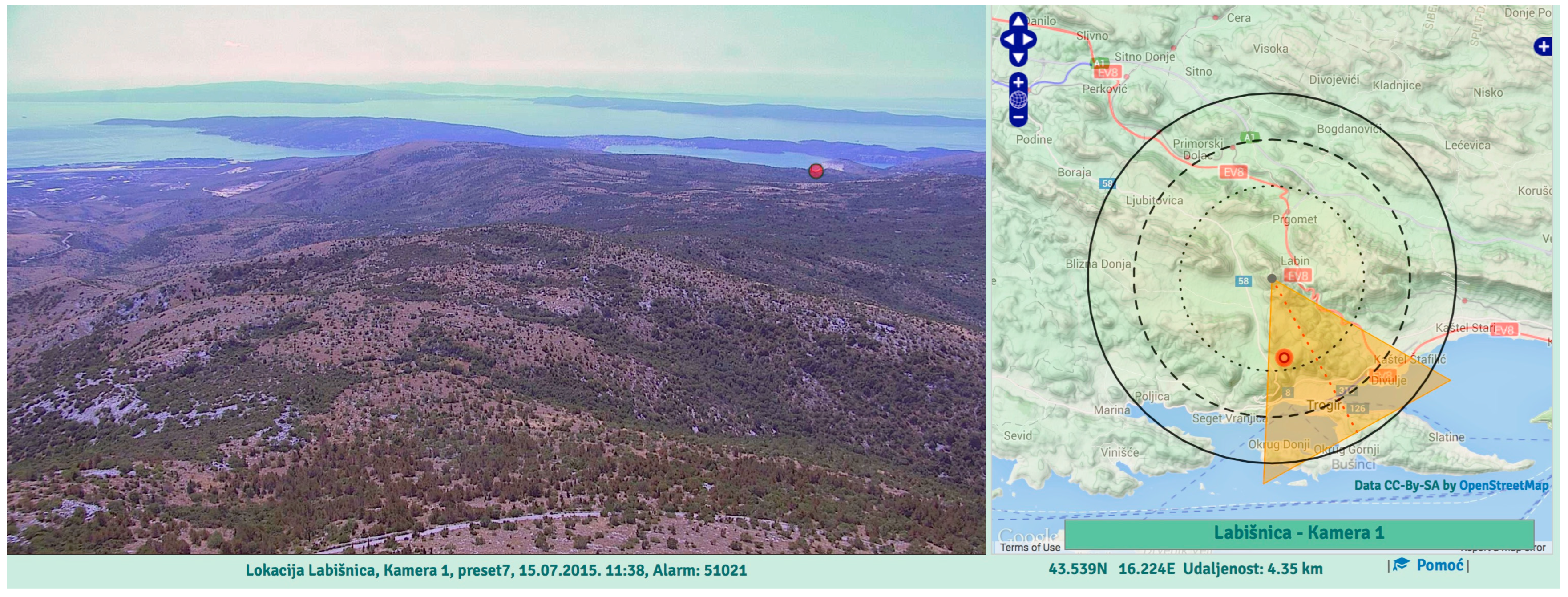 - Stipaničev, D.; Štula, M.; Krstinić, D.; Šerić, L.; Jakovčević, T.; Bugarić, M. Advanced Automatic Wildfire Surveillance and Monitoring Network. In Proceedings of the VI International Conference on Forest Fire Research, Coimbra, Portugal, 15–18 November 2010. [Google Scholar]