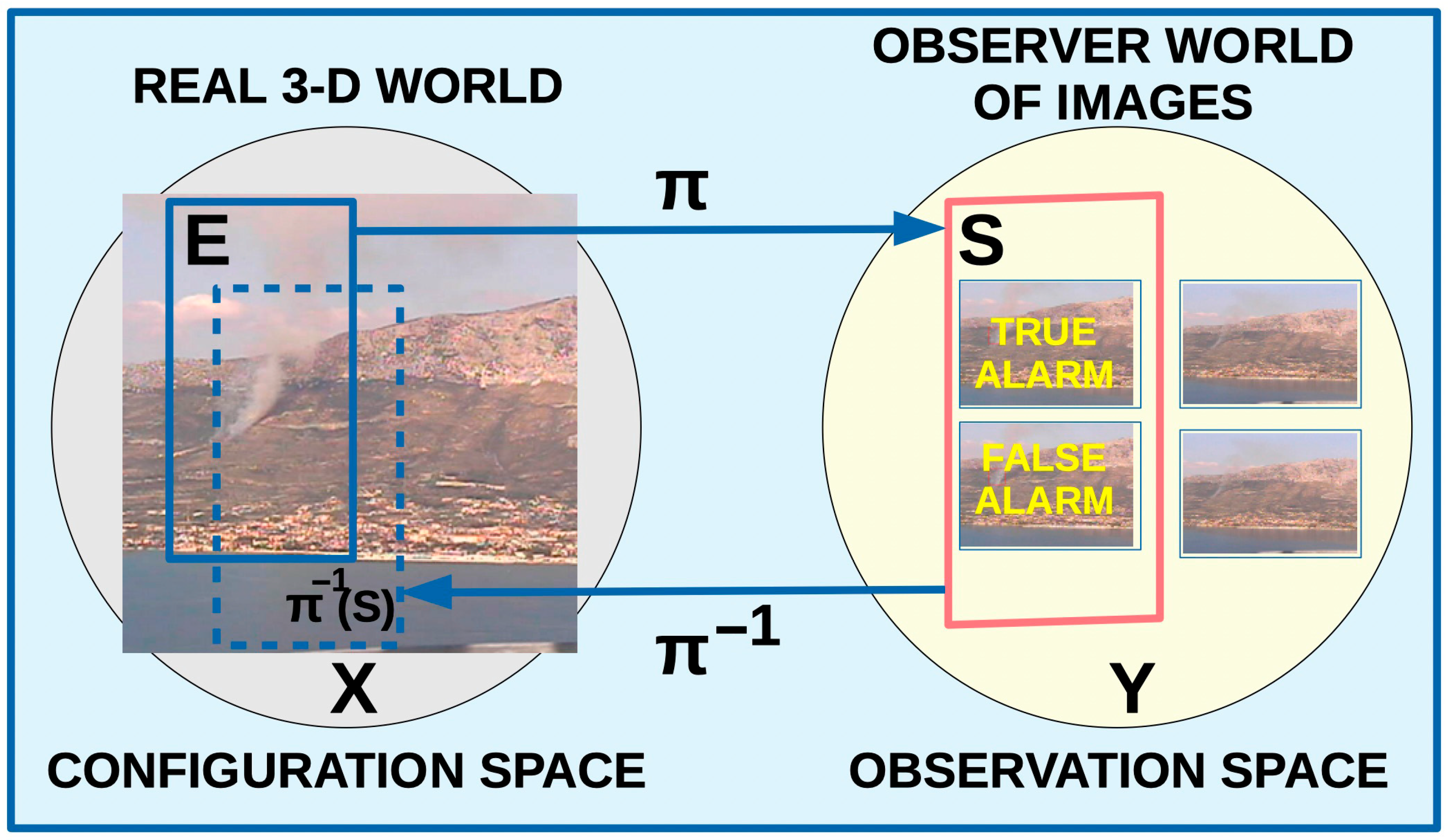 - Local evaluation at the image level, where the goal is to assess whether the observer correctly identifies the location of wildfire indicators, typically smoke in the early stages of a fire, and accurately recognizes the pixels where smoke is present on the image. For this evaluation, the ground truth images should be manually segmented, in the simplest case into two binary regions: areas where smoke is present and areas where smoke is not. The set E now includes smoke pixels, while its complement EC includes all other no-smoke pixels. Since smoke at its boundary areas is a semi-transparent phenomenon, fuzzy evaluation has also been proposed, where the smoke is segmented as a fuzzy set with increasing membership degrees from 0 to 1 [16].