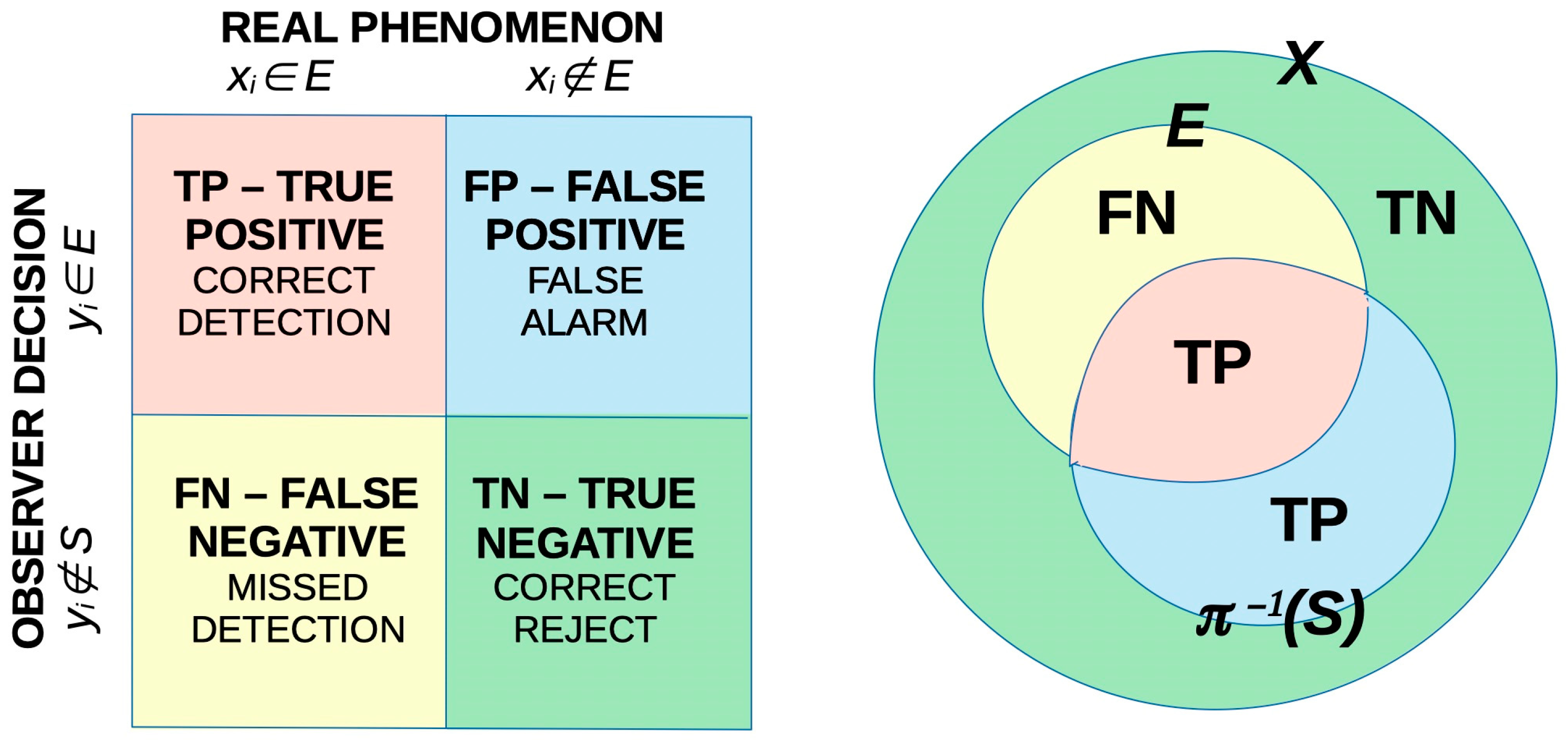 - If S is interpreted as not belonging to the wildfire and E does not belong to the wildfire, we have a Correct Rejection or True Negative, represented by the set TN = (π−1 (S)C∩ EC).
