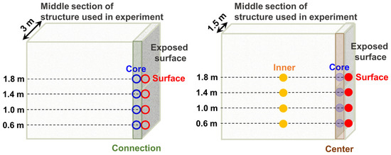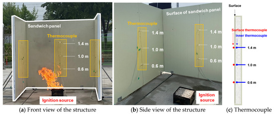 The distance between the sandwich panel and the ignition source was 1.0 m, which was determined in accordance with Article 242 of the Civil Act in Korea (construction near the boundary line) [22]. The ignition source (sand burner) was positioned 1 m from each panel to ensure that the sandwich panels, installed in a “⊓” shape to minimize wind effects, were exposed to a constant radiant heat source, as shown in Figure 1a,b. K-type thermocouples were positioned at varying heights (0.6, 1.0, and 1.4 m) along the central axis of the sandwich panel, on the surface, and within the core to ascertain the temperature as shown in Figure 1c.