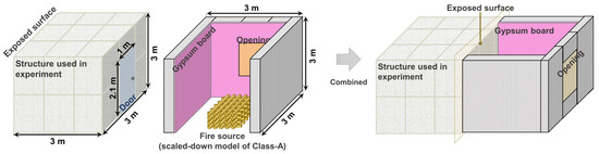 Figure 6 illustrates the preliminary experiment procedure. First, the sandwich panel was positioned in the shape of the symbol “⊓.” Before igniting the ignition source, the surface of the sandwich panel can be described as comprising three crucial conditions (Figure 7):