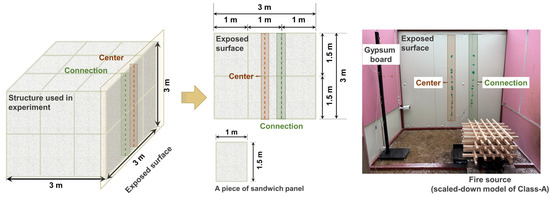 In a sandwich panel structure, fire spread throughout the structure is primarily facilitated by gaps in the connections between the panels created by the melting of interior materials. The temperature of the sandwich panel center and that of the joint were examined. Thermocouples were installed at varying heights (0.6, 1.0, 1.4, and 1.8 m) on the exterior surface of the structure and at depths within the panel to ascertain the temperature changes occurring within the structure, as shown in Figure 3. K-type thermocouples were utilized, with the precise installation location illustrated in Figure 4. A scaled-down model of the Class-A combustion model was developed to create an ignition source.
