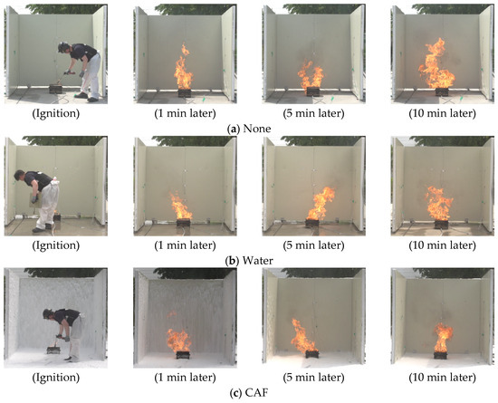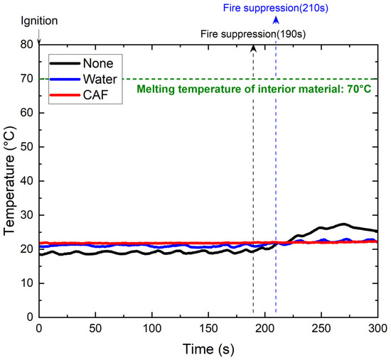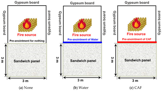 Before source ignition, the surface of the sandwich panel structure was prepared in accordance with one of the following three conditions: untreated, water-treated, and compressed air foam-treated. As shown in Figure 8, the untreated surface was called “None,” the water-treated surface was referred to as “Water,” and “CAF” indicated the pre-application surface by compressed air foam. Subsequently, the ignition source was ignited and the surface temperature was monitored. The experiment was conducted for 300 s, beginning with the ignition of the ignition source (0 s). In the event of a fire spreading to the sandwich panel, a forced extinguishment procedure was initiated to ensure safety. The experiment was repeated twice under identical conditions, and the mean of the two measurements was used to negate the impact of external factors on the results.
