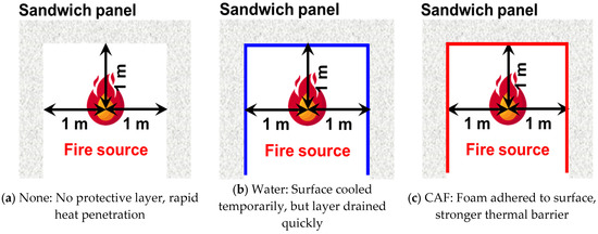 This study evaluated the influence of external fire on sandwich panels by comparing temperature increases at the surface, core, and compartment under three conditions: untreated (“None”), water pre-application (“Water”), and CAF pre-application (“CAF”).