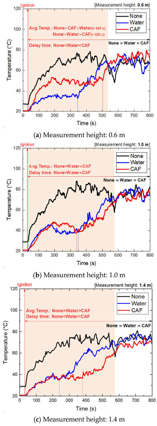 The preliminary results were analyzed by comparing the surface and core temperatures as shown in Figure 9. First, the average temperatures of water and CAF applied to the sandwich panel surface were examined for 600 s, the estimated time required for the agent to evaporate. A maximum temperature difference of 23.4 °C was observed on the surface for “Water” compared to the case of “None.” The “CAF” yielded a maximum temperature difference of 24.5 °C compared to “None.” However, a maximum temperature difference of 6.8 °C was observed between “Water” and “CAF.” Therefore, the pre-application of water to the surface of the sandwich panel structure in the vicinity of the fire can enhance the efficacy of thermal insulation within the structure by up to 33.9% without water and 38.1% with water, as indicated in Table 2. For each condition, two replicates were conducted, and the results showed consistent trends within a variation of approximately ±5 °C. Due to the small sample size (n = 2), statistical significance testing (e.g., t-tests or ANOVA) could not be performed with sufficient power. Instead, the mean values are presented together with the observed variation, which remained within a narrow range, thereby supporting the reliability of the reported heat blocking rates. However, the insulation material (Styrofoam) utilized for the internal insulation of sandwich panels had a melting point of 70 °C. Consequently, the insulation material melted when the internal temperature exceeded 70 °C owing to an external fire, facilitating the spread of the fire within the structure [23]. The average core temperature was 8.1 °C lower in the “Water” condition than that in “None.” However, the core temperature exceeded 70 °C, the inner material melting point, except for the measurement obtained at a height of 1.4 m, as shown in Figure 9. The surface application of the CAF resulted in a temperature reduction of up to 19.3 °C relative to the “None” condition and 14.7 °C relative to the “Water” application case. However, in particular circumstances, the melting point of the internal materials exceeded 70 °C despite a relatively modest temperature increase. The heat blocking rate of the thermal barrier to the core reached 34.9% and 28.8% in “None” and “Water” conditions, respectively, demonstrating the effectiveness of the thermal barrier to the core. The impact of elevated temperatures was examined to determine the viability of evacuating the occupants to minimize potential damage to the vicinity structures. The temperature increase was delayed at all heights as follows: CAF > Water > None.