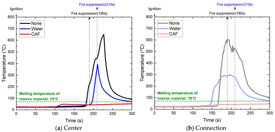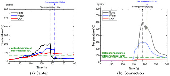 The time required to reach 70 °C was evaluated. At the panel center, as shown in Table 3, the melting point was reached in 103, 102, and 113 s for untreated panels, those treated with water, and those treated with CAF, respectively. For the connection areas, the melting point was reached in 97, 101, and 109 s for untreated panels, those treated with water, and those treated with CAFS, respectively. Upon reaching these temperatures, the temperature subsequently increased under the “None” and “Water” conditions. However, the rate of increase in temperature decreased with the application of CAF. This effect was attributable to the formation of dry foam (with an air-to-foam ratio of 1:14). This effect yielded a more pronounced surface adhesion than water and contained less moisture; thus, it evaporates more slowly than water [29,30,31]. Despite the initial application of water yielding a transient reduction in surface temperature owing to the cooling effects of evaporation, temperatures subsequently increased after water evaporation. The temperatures at the connection points were consistently higher than those at the panel center under all conditions. The maximum temperature difference was 253.6 °C without the application and 83.1 °C in the presence of water.