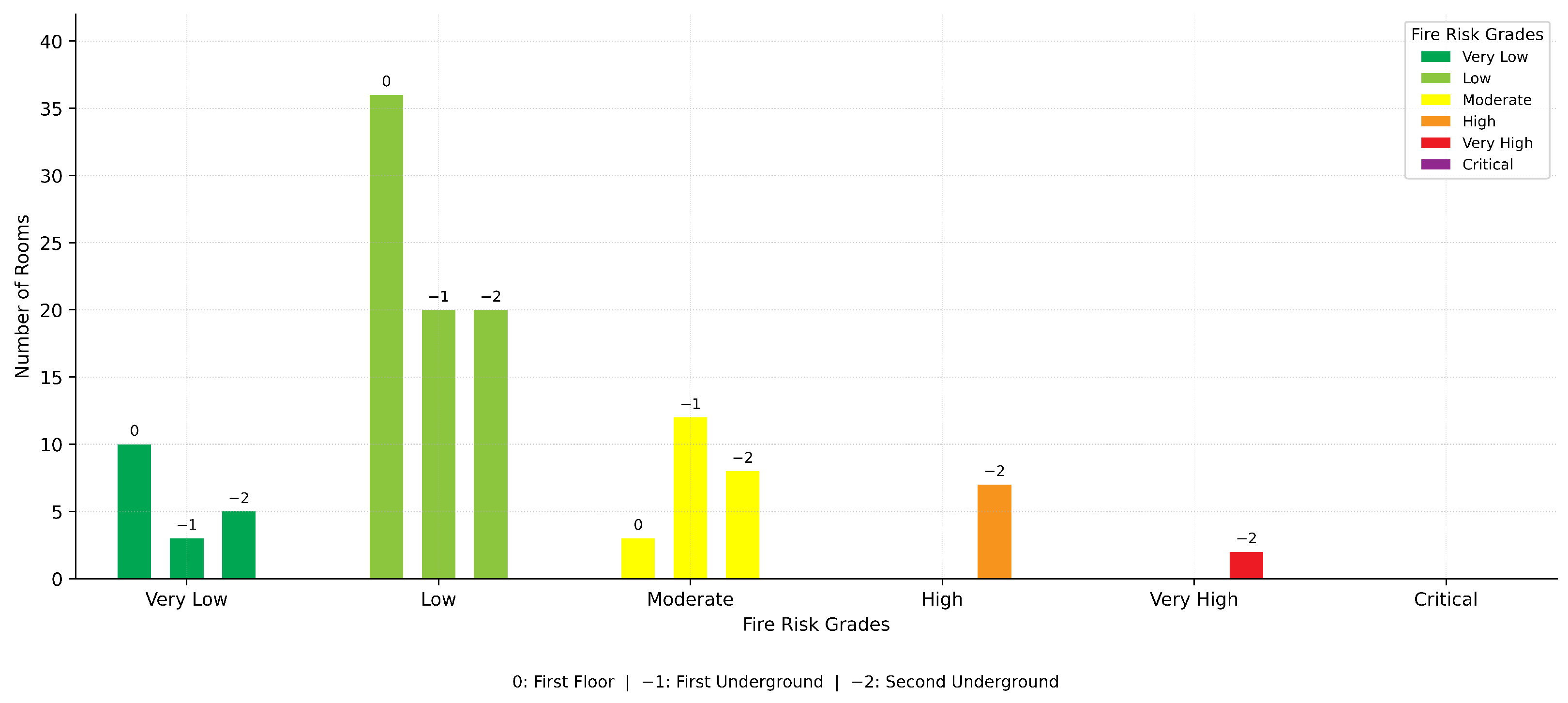 - Rabiei, H.; Zare, A.; Ahmadian Taheri, S.; Ebrahimi, N.; Mazaheri Tehrani, A.; Malakoutikhah, M. Fire risk assessment of Kashan’s commercial and shopping centers using fire risk assessment method for engineering (FRAME). Fire Mater. 2024, 48, 536–541. [Google Scholar] [CrossRef]