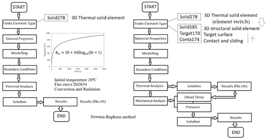 To create the thermo-mechanical computational model, at first, a thermal analysis with nonlinear materials was performed with ANSYS® 2020.R2. Then, it will be needed to use a combined analysis between the thermal process, reading the temperature at the time of fire exposure, and running it through a structural mechanical process, as shown in the flowchart presented in Figure 1.
