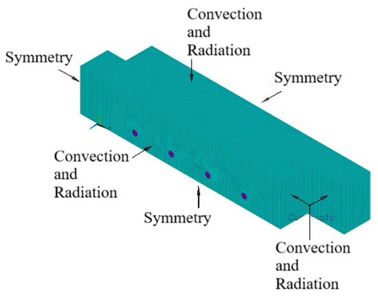 Mesh of the wooden connection and boundary conditions for thermal analysis. The blue colour represents the wood material and purple the steel dowels (represented in circles).
