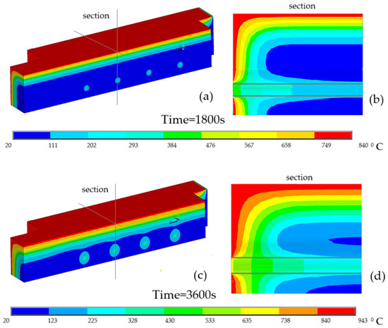 Thermal results of fire exposure: (a) in the wooden connection and (b) inside the cross-section, both for 1800 s; (c) in the wooden connection and (d) inside the cross-section, both for 3600 s.