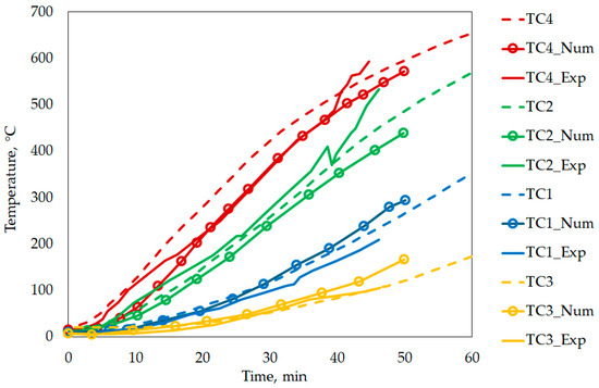The experimental model represents the temperatures obtained through four thermocouples placed inside the timber connection, at mid-height level, located in the central member (TC1_Exp and TC2_Exp) and the other two in the lateral member (TC3_Exp and TC4_Exp). Also, they presented the results in equivalent geometric positions obtained with the numerical model (TC1_Num, TC2_Num, TC3_Num and TC4_Num). The same study was carried out with the currently developed thermal model (TC1, TC2, TC3 and TC4).