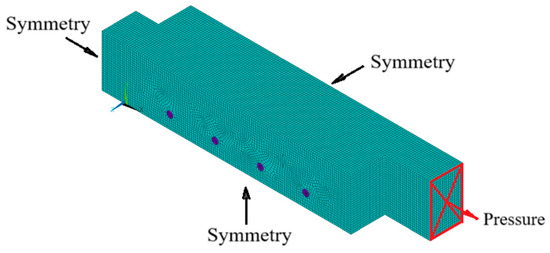 Figure 5 shows the finite element mesh and its boundary conditions, considering the symmetry on surfaces and load imposition, as a pressure.