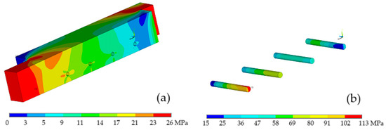 von Mises stresses in the structural numerical model: (a) in the wooden component and (b) in steel dowels.