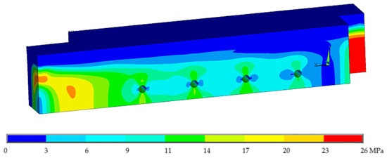 According to Eurocode 5, part 1-2 [12], the fire resistance time for an unprotected connection with dowels is 20 min (1200 s). In the fire test of the connections, according to the simplified method, the connection is tested for a load of 12 kN, corresponding to the result of the design actions in the fire exposure situation. According to the results of the thermo-mechanical analysis, for 1200 s of fire exposure, the connection tensile load is 12.66 kN, resulting in a safety factor of 1.05, considerably lower than that obtained through verification using Eurocode 5, part 1-2 [12]. Furthermore, as seen in Figure 12, the maximum stress supported by the connection now of failure is 10 MPa, much lower than the tensile strength under fire exposure, calculated using the simplified method, of 23.55 MPa.