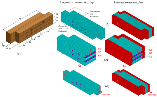 Wooden unprotected and protected connection: (a) dimensions, (b) boundary conditions for fire exposure, (c) nodal points to control, (d) boundary conditions for structural analysis. The blue colour represents the wood material, purple steel dowels (represented in circles), and red represents the gypsum board.