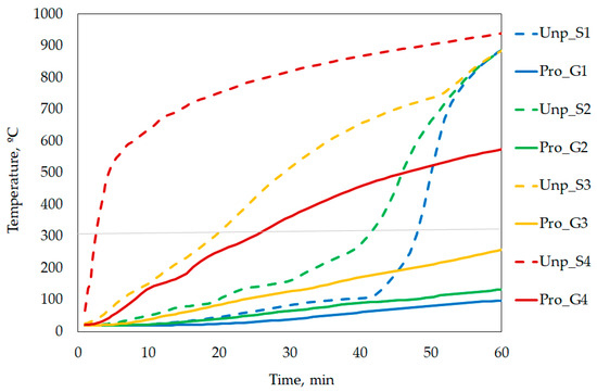 Using the developed solution, a cross-section is selected at the level of two dowels to analyse heat transfer within the connection, as shown in Figure 8c. Specific nodes are considered to track temperature changes: S1 on the non-fire-exposed surface, S2 outside the dowel, S3 inside the dowel, and S4 on the fire-exposed surface for the unprotected connection (Unp). In the protected connection (Pro), nodes G1, G2, G3, and G4 correspond to the same points.