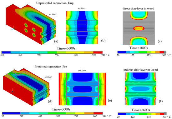 Temperature distribution: (a) isometric view at 3600 s, (b) cross-section at 3600 s and (c) char layer at 1800 s, both for unprotected connection; (d) isometric view, (e) cross-section and (f) char layer, both for protected connection at 3600 s.