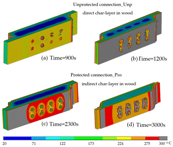 Figure 10 shows the temperature field in the protected and unprotected connections under fire exposure. In (a) part of the three-dimensional connection is presented, in (b) the cross-section with all materials considered in the study to better verify the temperature distribution, and in (c) the char layer in wood material at different time instants.