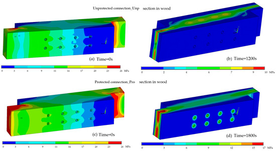 von-Mises stresses: (a) at ambient temperature and (b) at fire exposure for a time of 1200 s, both in the wood unprotected component; (c) at ambient temperature and (d) at fire exposure for a time of 1800 s, both in the wood protected component.