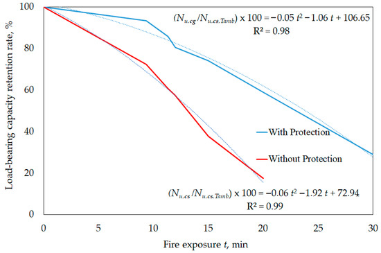In thermo-mechanical analysis, the load-bearing capacity of connections is evaluated at different times of fire exposure, aiming to quantify the decrease in mechanical strength over time and analyse the efficiency of the plasterboard protection. Figure 13 presents the results obtained, with second-degree polynomial trend curves. The corresponding equations are provided in the graph, allowing the prediction of the load-bearing capacity retention rate as a function of the fire exposure time. It is also observed that the square of Pearson’s correlation coefficient R is very close to 1 in both cases, indicating a high degree of correlation between the results and the curves obtained.