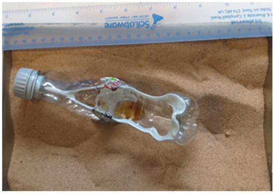 Example laboratory experiment set-up showing a bottle after heating for 2 min under a heat flux of 15 kW/m2 on a bed of sand.
