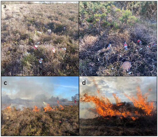 Field experiments were undertaken during the UK prescribed fire season in collaboration with prescribed burns teams that comprised local landowners (Forestry England, National Trust and the RSPB) during winter 2020 in the southwest UK. Both fires were about 5000 m2: a burn near ‘Isolation Cottages’, at 50.658261° N, −2.082876° W, was undertaken on 29 January 2020 (later in the text referred as IC), and another burn near Furzebrook Road (later referred as FB), at 50.667366° N, −2.107124° W, was performed on 4 February 2020. During both fires it was sunny, ~10 °C and wind speeds were on average ~2 m/s, with some wind gusts up to 6–9 m/s. At the IC site, the vegetation consisted mostly of heather (mostly Erica cinerea and Calluna vulgaris) with Molinia caerulea in wetter areas (Figure 2a); the fire did not spread well, and areas of fuel mainly torched and went out on application of fire (Figure 2c). At the FB location there was a relatively heavy load of Ulex europeaus on the site, with an understory of heather (mostly E. cinerea and E. tetralix) and Molinia caerulea (Figure 2b); a head fire was allowed to spread rapidly across the site with long flame lengths (Figure 2d).