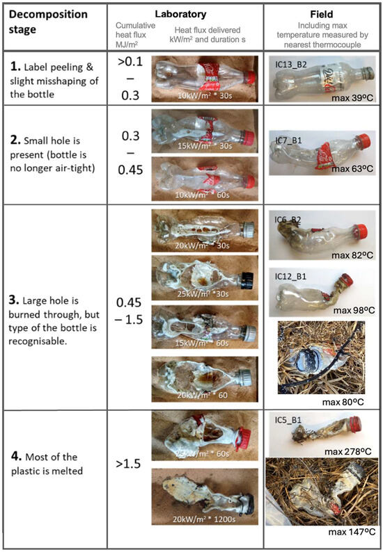 Both laboratory-heated and field-heated plastic bottles deformed in a similar way. The thermocouples placed next to the bottles in the field, which corresponded in form to those generated in the laboratory, gave maximum temperatures that ranged 39–278 °C (Figure 3). The temperatures are largely consistent with the temperature at the surface of the items in the laboratory experiments (Table 1). So although the thermocouples could not be placed directly on the bottles in the field, the temperatures resulting in the field deformations appear relatively consistent with those generated in the lab. Lidded plastic bottles deformed in response to increasing heat flux in a predictable way that we suggest can be arranged into four distinctive stages (Figure 3). Stage 0: a bottle exposed to <0.1 MJ/m2 does not have any identifiable deformations. Stage 1a: a bottle exposed to >0.1 MJ/m2 reacts by first peeling its label; during stage 1b: when exposed to >0.2 MJ/m2 a slight deformation of plastic is present, but the bottle is still airtight. Stage 2: if a lidded bottle experiences > 0.3 MJ/m2, then heated air inside the bottle reaches significant pressure that plastic walls that were weakened by heating burst and a small hole forms. Stage 3: for >0.45 MJ/m2 the section of the bottle that is the closest to the source of heat melts, forming a large hole, but the other side of the bottle retains its shape (it is still possible to recognise the type of container). Stage 4: for total energies > 1.5 MJ/m2 the bottle melts, becoming highly deformed, and no longer retains its shape. If a high enough energy is sustained, then the bottle will eventually disintegrate completely.