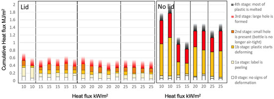 Minimal cumulative heat flux (MJ/m2) (heat flux multiplied by duration of time applied) at heat fluxes from 10 to 25 kW/m2 required to deform lidded and un-lidded plastic bottles to different degradation stages based on laboratory experiments.