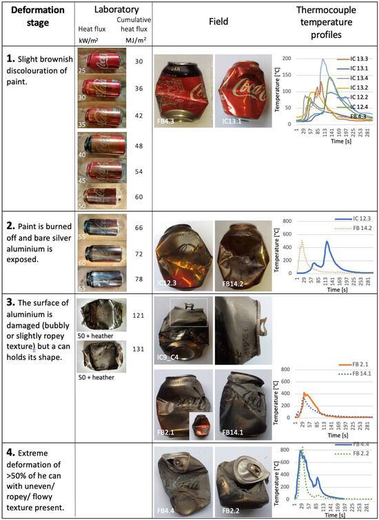 Stages of aluminium can deformation when exposed to specific amounts of energy during laboratory and field experiments, including thermocouple readings from the field.