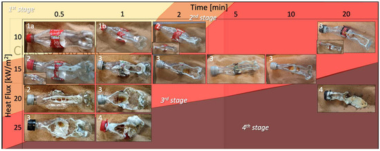 Our tests suggest that plastic bottles make good markers for the energy flux from wildfires of lower intensities, where they might suggest heating in the range of <25 kW/m2 that is only sustained for minutes (Figure 3 and Figure 4). Within this range, plastic Coca-Cola brand bottles visually indicate a four-stage set of changes corresponding to the amount of energy that was locally delivered to them. If more than ~1.5–2 MJ/m2 is delivered to the specific location, plastic bottles melt completely, so they are not a practical proxy to monitor the energy of more intense wildfires. It is important to note that plastic deformation depends more strongly on the total energy experienced, not the heat flux/duration/maximal temperature alone (Figure 6). Because of this, the same stage of deformation may be produced by the same heat flux over different durations: e.g., a bottle heated at a heat flux of 10 kW/m2 for 0.5 min reaches only stage 1 (peeling of the label), if heated for 1 min it becomes deformed but is still airtight (stage 2) and when heated for two minutes it is no longer airtight (stage 2), but to produce deformation equal to stage 3 requires 20 min of sustained heat flux (Figure 6). The deformation produced and shown in Figure 6 is a result of the cumulative heat flux experienced by a given sample (calculated as heat flux × time, e.g., 20 kW/m2 × 1 min = 1.2 MJ/m2); hence, the same heat flux may give different deformation depending on the duration, e.g., 20 kW/m2 for 1 min produced stage 3 deformation, but the same heat flux for 20 min was capable of producing stage 4 deformation. Hence, it is important to consider the cumulative heat flux. Additionally, the stage of deformation also depends on whether a bottle was lidded/air-tight before the wildfire, with unlidded bottles being able to survive exposure to slightly higher energy ranges (Figure 4). Whilst we suggest that the general deformation stages are likely to be the same for bottles from different brands, the energy thresholds are likely to be shifted depending on the thickness and to a lesser degree shape of the plastic. This is highlighted by the bottle tops, which are of different plastic to the bottles themselves, and which appeared more thermally resistant than the bottles.