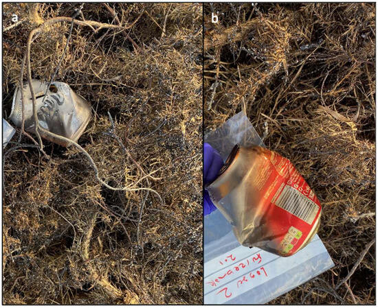 Each trash plot was instrumented with four type K-310 Stainless Steel Sheath 1.00 mm diameter × 1500 mm long thermocouples (supplied by TC direct, Uxbridge, UK) which were attached to Testo 176 T4 battery-powered LCD display temperature data loggers (Testo, Alton, UK). Twelve trash items were monitored at the FB site and forty-eight at the IC site. The thermocouples were placed into the opening of the Coca-Cola brand cans to keep them in place. Thermocouples were placed next to the plastic bottles, so that plastic did not melt onto them and destroy the thermocouple tips. The fires were lit by prescribed burn teams using a drip-torch along the edges of the prescribed fire plots and the fires were allowed to burn towards the regions containing the instrumented cans and bottles. Due to the patchy nature of the low-intensity fire, particularly at Isolation Cottages, not all samples were exposed to burning and some of the cans and bottles remained unmodified. Afterwards, thermocouples and all cans and bottles were photographed in the field, collected, labeled, and brought to the laboratory.