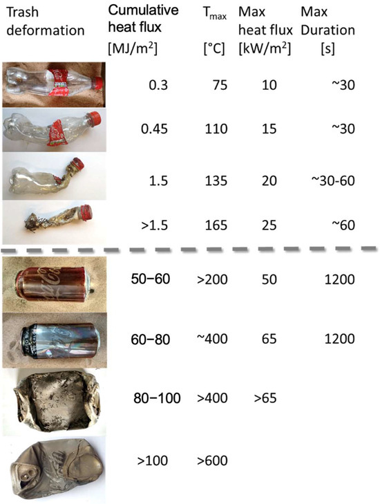 We found that the intensity of heating (cumulative heat flux) also plays a role in producing trash deformation; it is especially important for the lowest heat fluxes. For example, little deformation was observed at <10 kW/m2 even when exposed for >20 min (sum of 12 MJ/m2), but at >25 kW/m2 heat flux the plastic was melted to a liquid in less than 2 min (1.5 MJ/m2).