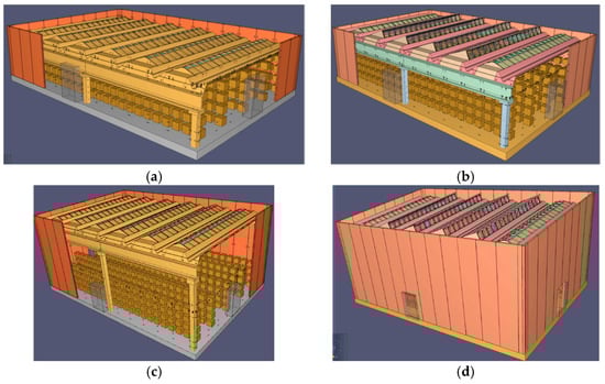 Case study archetypal precast industrial structures with: (a) vaulted roof—6 m; (b) shed roof—6 m; (c) vaulted roof—12 m; (d) shed roof—12 m. In subfigures (a–c) the cladding panels are partially removed to allow for the visualisation of the internal fuel distribution.