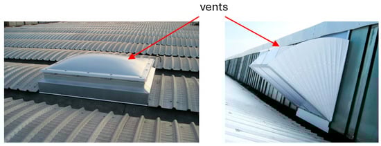 The buildings, if constructed following the current fire regulations in Italy, could have been protected by an active fire control system (e.g., sprinkler), according to the strategy chosen by the designer [2,33]. In addition, vents for a faster evacuation of smoke and heat would be installed in the roof, despite the large area of windows typically made of low-temperature-melting PC honeycomb glazing. Typical vents for natural ventilation installed in industrial building roofs are shown in Figure 3, including both configurations for barrel vaults and for sheds. They can be designed following a simple conservative prescription of a minimum ventilation surface of 1/40 to 1/25 of the floor area depending of the fire load (leading to 24.7 m2 to 39.5 m2 of ventilation surface – the latter associated with the fire load if the case study, with the prescription to install 4 m2 of vents) or, alternatively, their design can follow the specific Italian norm UNI 9494 [34]. The application of this standard would lead to the installation of a minimum vent surface of 6.1 m2 and 3.5 m2 for the 6 m tall and for the 12 m tall buildings, respectively, assuming a height of the smoke interface of 3 m above the pavement. The presence of vents is included in the parametric analysis carried out with the zone models.