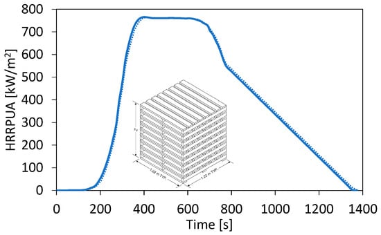 As fuel, cellulosic materials were selected. The definition of the combustion properties was carried out fully based on experimental data. In particular, the curve of heat release rate per unit area (HRRPUA) shown in Figure 4 was derived based on the experimental heat release rate (HRR) curve associated with burning of a wood crib with a side equal to 1.22 m and a height of 1 m below an oxygen-consumption calorimeter, as described in the SPFE handbook [40]. In particular, the original HRR curve was modified initially adjusting the recorded value over time up to the assumed complete combustion of the crib [41]. This was performed with a linear softening branch by imposing to the curve a total fire load of 2521 MJ, based on the evaluation of its integral function (Figure 3). The HRR curve was then divided by the exposed surface of the original test specimen.