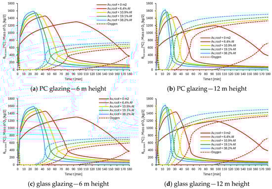 The results of combined models (two zones collapsing into a single zone when the flashover condition is met) are reported in Figure 5 in terms of hot zone temperature and oxygen mass time histories, for different degrees of opening area, expressed as a percentage of the floor area. The case study vault and shed configurations are represented by 6.4% and 10.9%, respectively. Moreover, a lower bound condition without openings was investigated, as well as conditions with larger window areas on the roof, 3 and 6 times larger than that associated with the vault configuration.