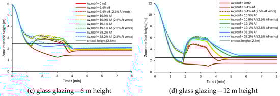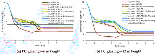 In order to better investigate the effect of the type of glazing and the possible presence of smoke and heat evacuators in the roof, specific analyses were conducted by refining the numerical integration in the early stage of the analysis, selecting a two-zone model in order to investigate the time history of the zone interface height. For the models with smoke and heat evacuators, the options of a large area of 1/40 of the floor surface (larger than the minimum required with both prescriptive and performance approaches, as described above) and lower activation temperature of 68 °C were selected, providing the best evacuation measure to be reasonably designed for the building. It is recalled that the zone models provide conservative results in terms of smoke and heat layering in the compartment, since all the combustible is assumed to take fire instantaneously, and thus the results need to be considered comparatively. The results, shown in Figure 6, highlight a less clear dependence of the smoke layering with time on the window area. As expected, the lower bound is always attained without roof openings. However, in the case with a building height of 6 m, the interface lowers earlier with a larger opening area, indicating the predominant effect of the larger oxygen inlet with respect to the larger evacuation, whereas in the case of a building height of 12 m, the case with lower window area appears to be more severe. Moreover, there are limited differences within the cases with lower and larger glazing surfaces. The building height plays a role in this parameter, with the lower building associated with more rapid layering of smoke and heat down to the area of interest for the safe evacuation of the occupants. In this short initial time window, there is a remarkable difference between PC and glass glazing. In particular, the cases with glass windows allow the interface to get lower than 2.5 m before the windows lose integrity in all analyses, whereas in the cases with PC windows they lose integrity much earlier, allowing for a better performance in terms of delaying the interface quote to lower. This also explains why the efficiency of the evacuators seems limited when PC windows are used. Nevertheless, the installation of the evacuators proves to be efficient in the case where glass windows are used.