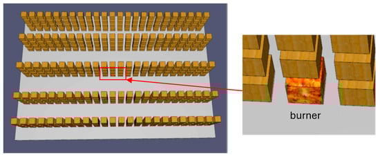 A regular distribution of cellulosic combustible was implemented in the form of cubic boxes of 1 m3, distributed simulating an accumulation of piled material beside distributive corridors, as shown in Figure 2. The boxes were placed at a relative distance of 0.4 m in the vertical and in the horizontal direction parallel to the corridors.