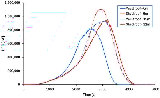Figure 9 shows the resulting HRR curves. Very high peak HRR was obtained for all curves, associated with specific values of about 850 kW/m2 to 1100 kW/m2 for vault short and shed tall roof, respectively. However, it is worth noting that such a peak is only indicative, since the thermal power associated with flames burning out of the numerical domain (out of the windows and further out of the domain layer of about 1 m) is lost. Therefore, the HRR peak shall be interpreted as a lower bound result.