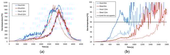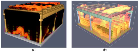 The fire progressively propagated from the starter box (burner) following the upward curve of the HRR diagrams, attaining a flashover condition after around 2200 s from the ignition for the model with a vault roof (Figure 10a) and soon after for the model with a shed roof (Figure 10b).