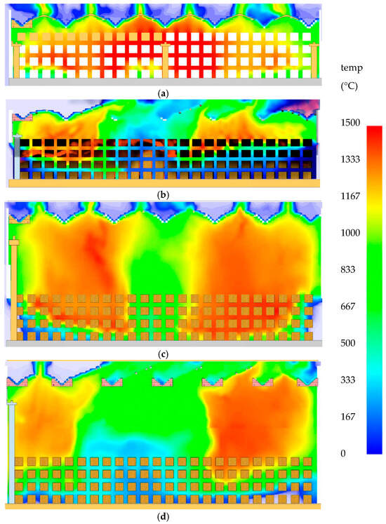 Temperature over central slice parallel to beams at flashover: (a) vault roof 6 m; (b) shed roof 6 m; (c) vault roof 12 m; (d) shed roof 12 m.
