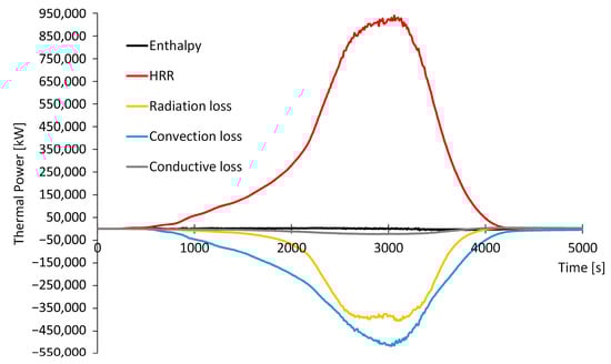 The power time histories associated with both the input HRR and the output heat dispersion mechanisms are shown in Figure 12 for the analysis with the vault roof and a lower building height. The plots clearly show that the heat dissipation mechanism occurs predominantly by convection, i.e., by the evacuation of smoke and heat through the openings. The radiation contribution is lower, but still comparable. The conduction contribution through the opaque building envelope surfaces appears to be very limited, to the extent that it might be considered negligible. Other contributions, such as air pressure change or expansion of gases, are not even represented, since their values are extremely low and definitely negligible. The plot of the enthalpy shows limited resulting powers, positive in the first part of the fire (around pre-peak), where the production of heat is predominant, and negative in the second part of the fire (around post-peak) due to the predominant smoke and heat evacuation term.