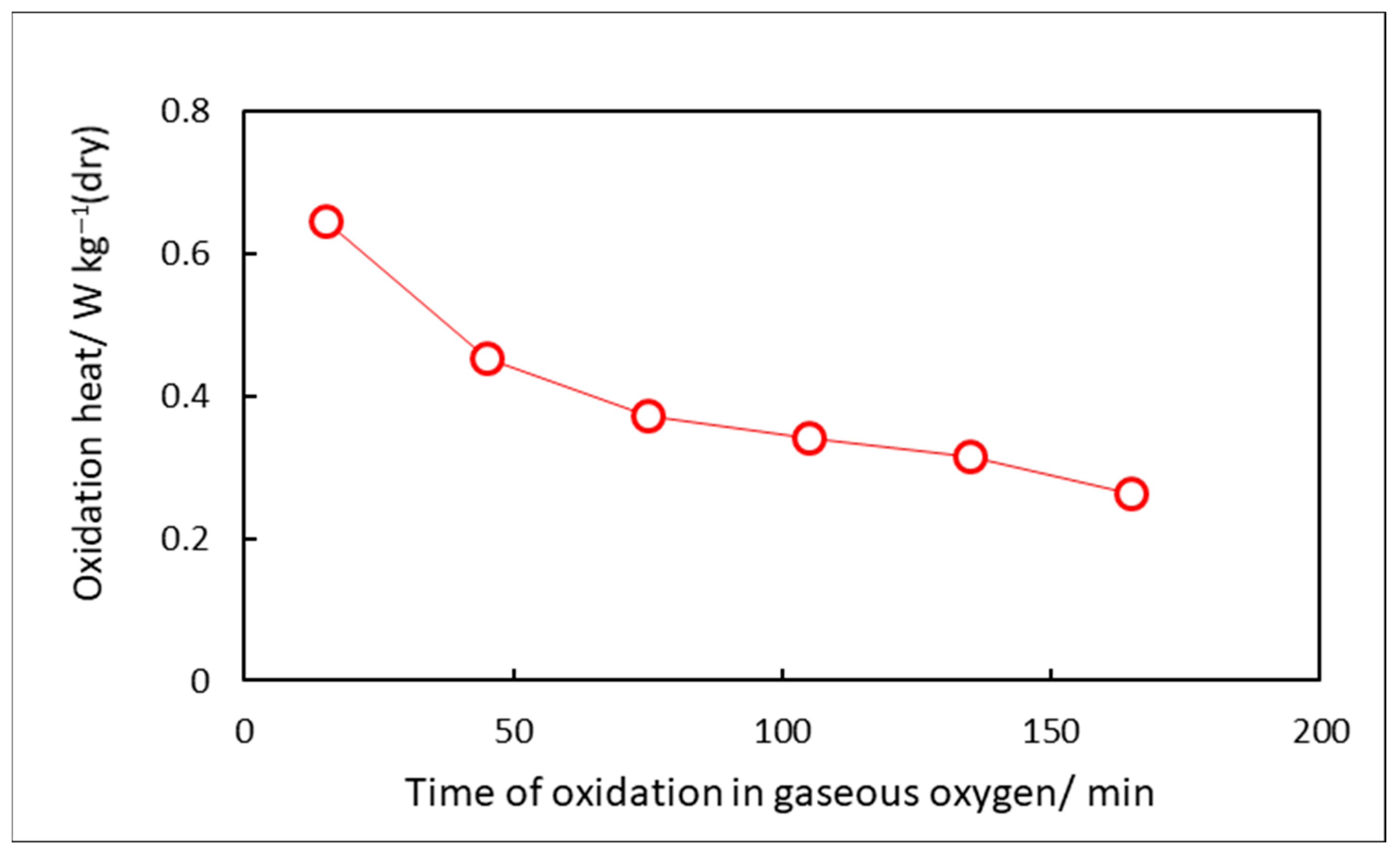 | Oxidation Heat q30, W kg−1 (dry) * | Moisture Content, MC, % ** | Oxidation Heat q30, W kg−1 (dry) | Moisture Content, MC, % | |