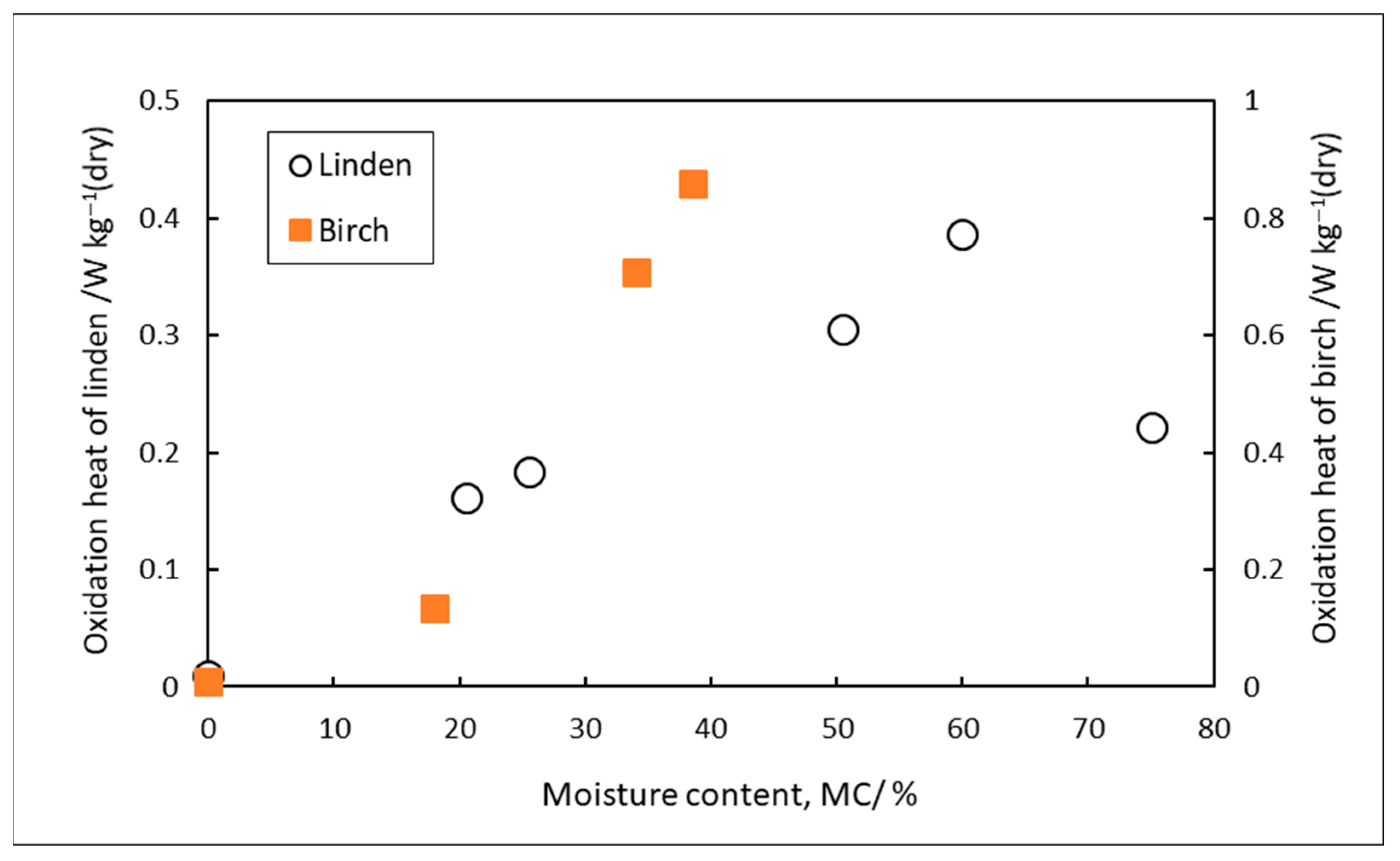 - Oxidation heat q30 of fresh wood taken from ten tree types was found to vary between 0.45 W kg−1 (dry) and 1.1 W kg−1 (dry).