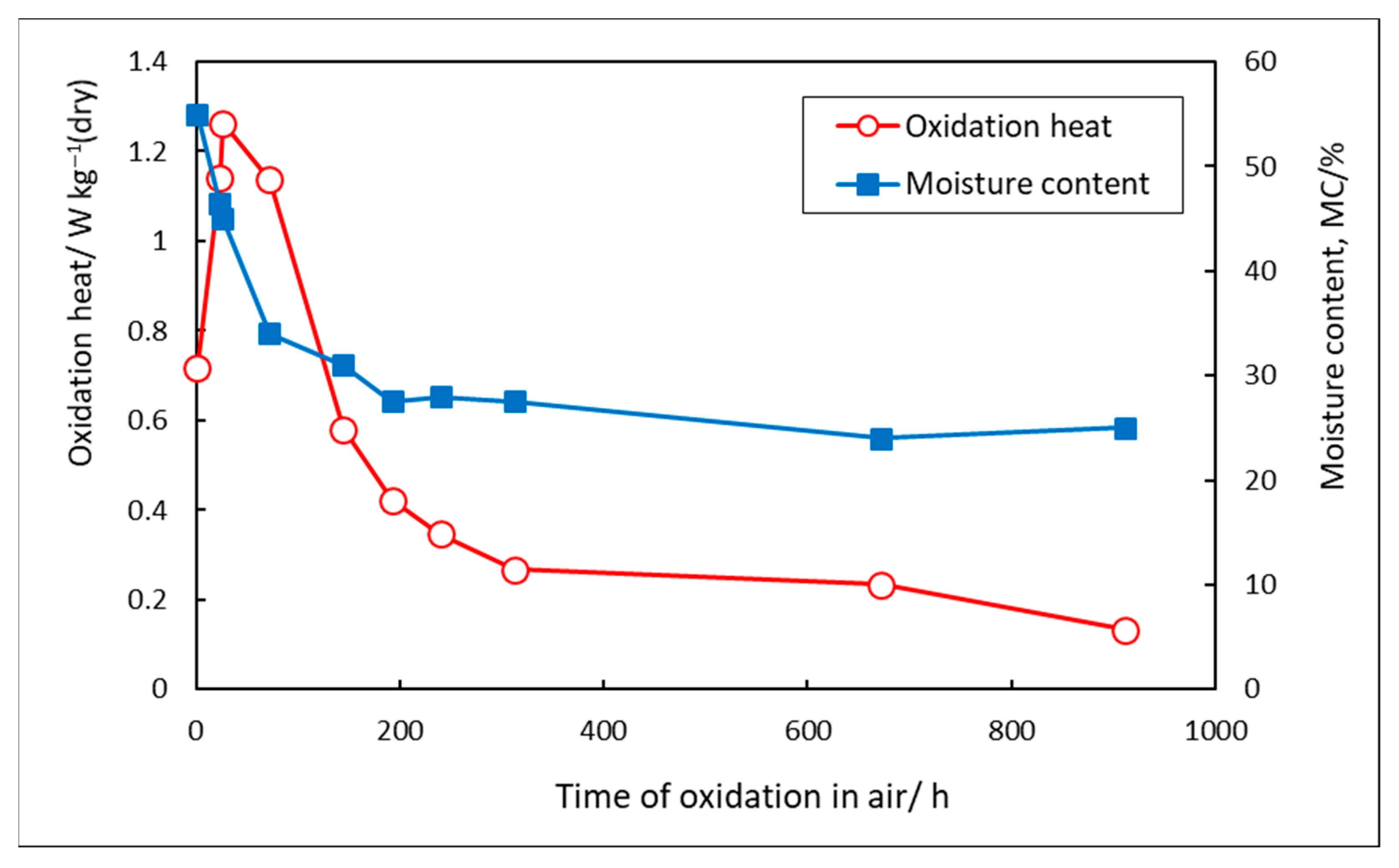 - Moisture in wood acts as an accelerator of oxidation heat production. For dried wood, virtually no measurable evolution of the oxidation heat was observed.