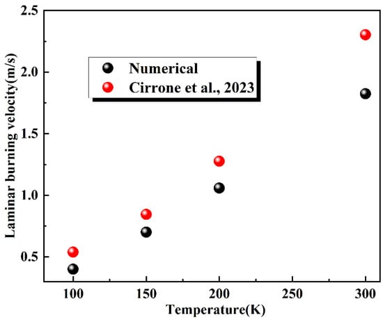 To validate the mechanism’s applicability under cryogenic conditions, the laminar burning velocity was numerically calculated for stoichiometric hydrogen–air mixtures at various initial temperatures. A comparative analysis with reference data from the literature [30] is presented in Figure 2. The computed values are consistent with the overall trend of the data, and the relative errors fall within the acceptable range. This also confirms the reliability and practical utility of the reaction mechanism for cryogenic applications.
