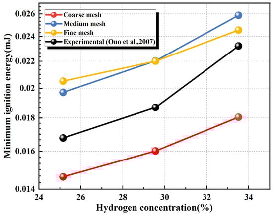 As shown in Figure 3, mesh refinement is applied within the central area of the computational domain, defined as a circular region centered on the ignition origin at (0.01, 0) with a radius of 2 × 10−3 m. Fine, medium, and coarse meshes are used for independence verification. The ignition success criterion is described in detail in Section 2.6. The MIE of hydrogen–air mixtures at various concentrations and ambient temperatures is simulated at different mesh resolutions. The simulation results are compared with experimental values in Figure 4. A significant deviation is observed for the coarse and medium meshes. The relative error between the simulation results of the medium and fine meshes is less than 5%, but the computation cost increases several times. Therefore, given mesh convergence, enhanced computational efficiency, and the need to preserve accuracy, the medium mesh is ultimately adopted.
