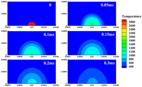 Figure 5 depicts the temporal evolution of the temperature field after ignition in a hydrogen–air mixture (Φ = 1.4). The flame kernel propagates spherically outward. The central temperature exhibits a transient decrease (0~0.15 ms) followed by sustained elevation (>0.15 ms), indicating that high-temperature reactions dominate over heat-dissipation mechanisms, thereby enabling a self-sustained process. In contrast, Figure 6 presents a scenario of failed ignition. After ignition, the central temperature rises to a peak and then rapidly declines to 800 K within 0.2 ms, exhibiting a characteristic decay profile. The combustion fails to expand effectively, and the temperature eventually drops to the initial value. Figure 7 provides kinetic confirmation of the temperature-field evolution shown in Figure 5, as evidenced by the concurrent increase in the peak OH molar fraction and the integral mass of water vapor. Their synergistic rise indicates that chain-branching reactions persist, and the positive feedback between reactive-radical concentrations and combustion-product accumulation further corroborates the chemical-kinetic criterion for successful ignition.