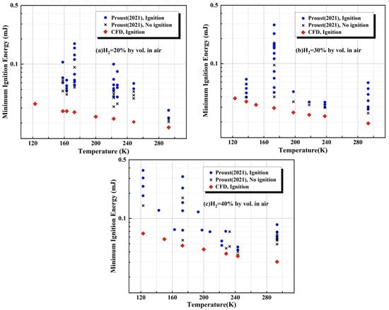 Figure 9 compares the simulated MIE of hydrogen–air mixtures with hydrogen volume fractions of 20%, 30%, and 40% over a temperature range of 123~293 K against the experimental data reported by Proust et al. [29]. The blue “○” and black “×” indicate the successful and failed conditions of ignition, respectively, and the red “◇” indicates the simulated values in this study. The experiments show a clear overall trend: the MIE increases as the initial temperature decreases. For the 20 vol.% hydrogen–air mixture, when the initial temperature drops from 293 K to 158 K, the measured MIE rises from 23 μJ to 60 μJ. The simulated MIE values obtained in this study capture this temperature dependence well and agree with the experimental trend. For the 40 vol.% hydrogen–air mixture, the experimental MIE increases from 58 μJ to 188 μJ as the initial temperature decreases from 293 K to 123 K. Under the condition of 30 vol.% hydrogen at an initial temperature of 137 K, the relative error reaches 13%; similarly, at 40 vol.% hydrogen and 243 K, the relative error is 14%. Overall, the relative errors remain within an acceptable range. Nonetheless, the predicted MIE values are consistently lower than the experimental measurements across all cases.